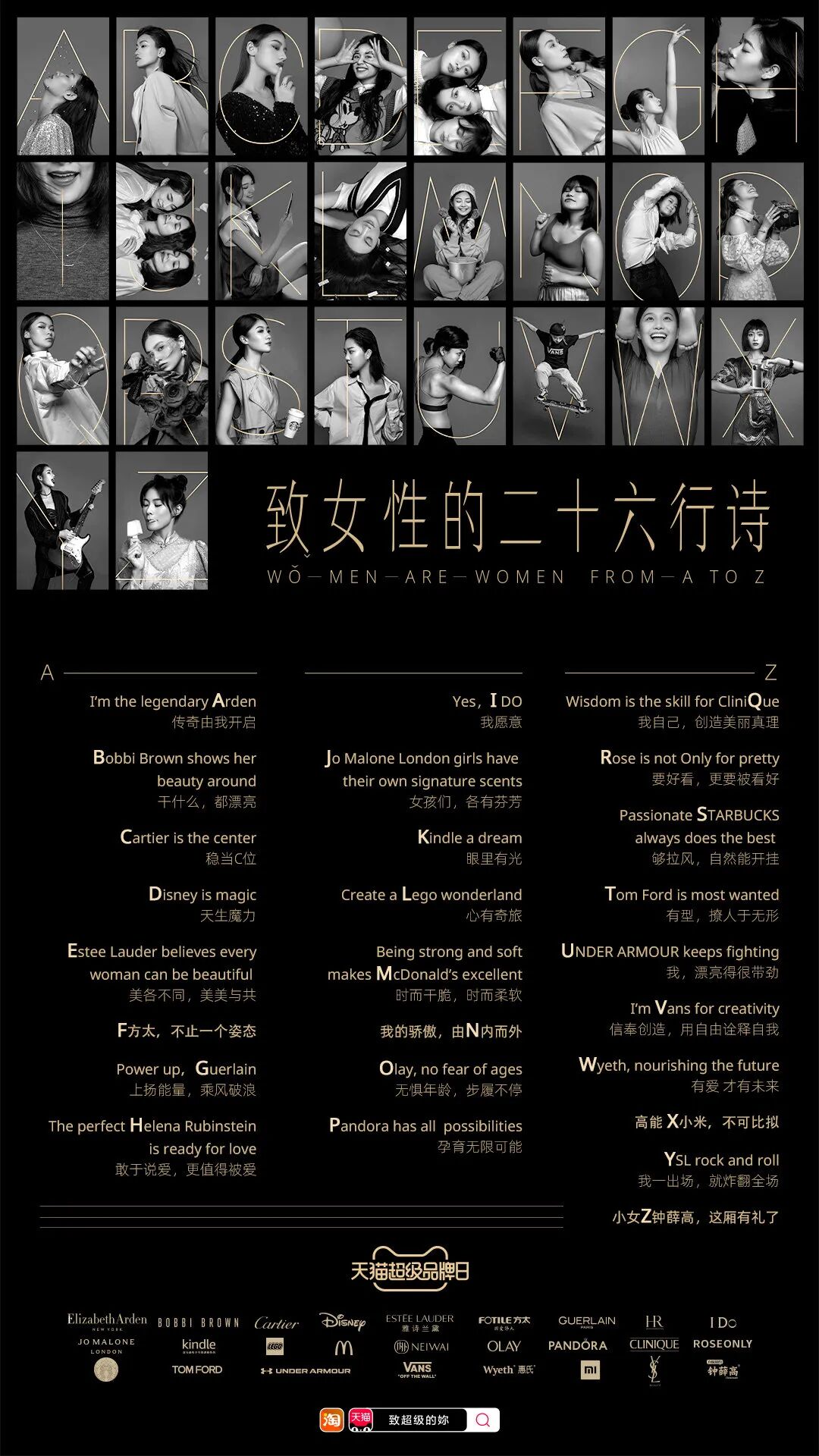 天猫超级品牌日发布品牌集合片,以「我们(WO MEN)是 WOMEN」为主题,从A-Z串联26个具有女性价值的超级品牌,打造《致女生的26行诗》。品牌名=女性姓名输出的每句格言诗,既符合品牌本身调性也能够有力传达不同的女性价值。